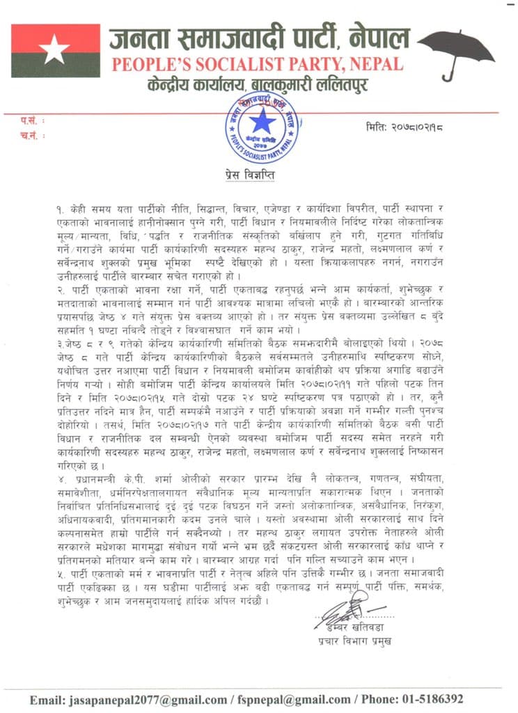 जसपा अध्यक्ष ठाकुरसहित महतो,कर्ण र शुक्ला निष्काशित