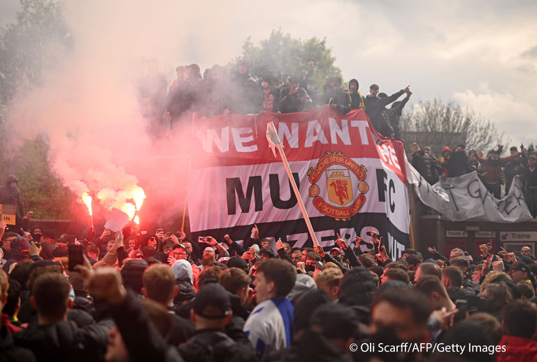 लिभरपुलविरुद्धको खेलअघि युनाइटेड समर्थकले गरे विरोध प्रदर्शन